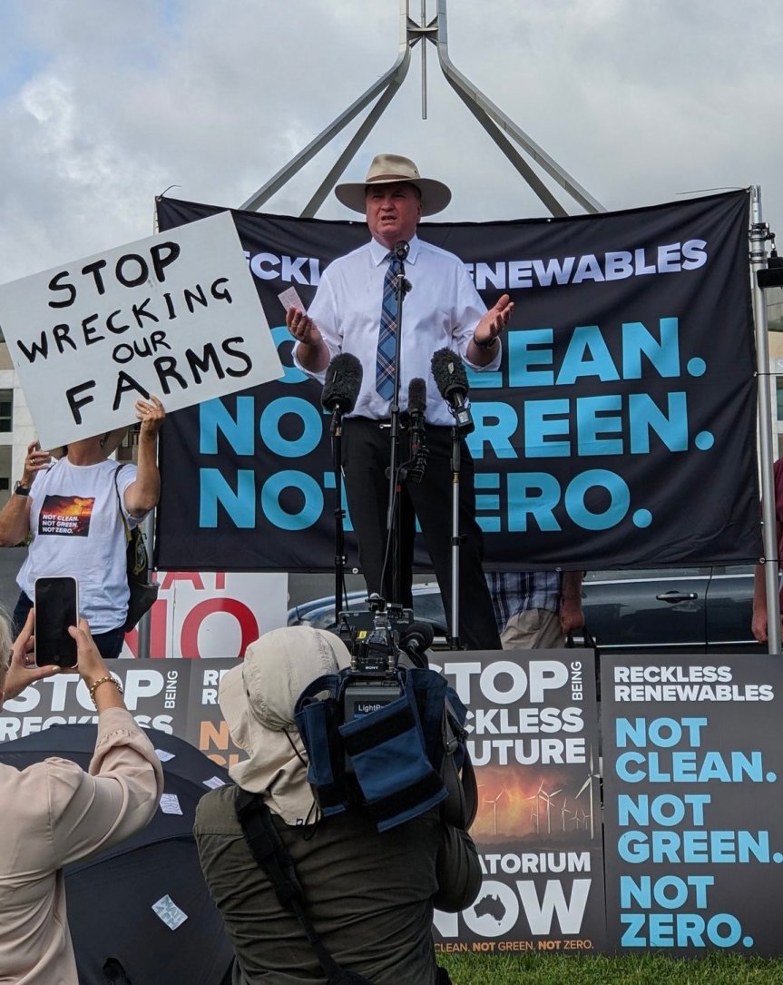 Nationals Senator Barnaby Joyce, who attended with his former staffer and wife Vikki Campion told the rally that the new construction of wind and solar farms would risk killing off protected wildlife.