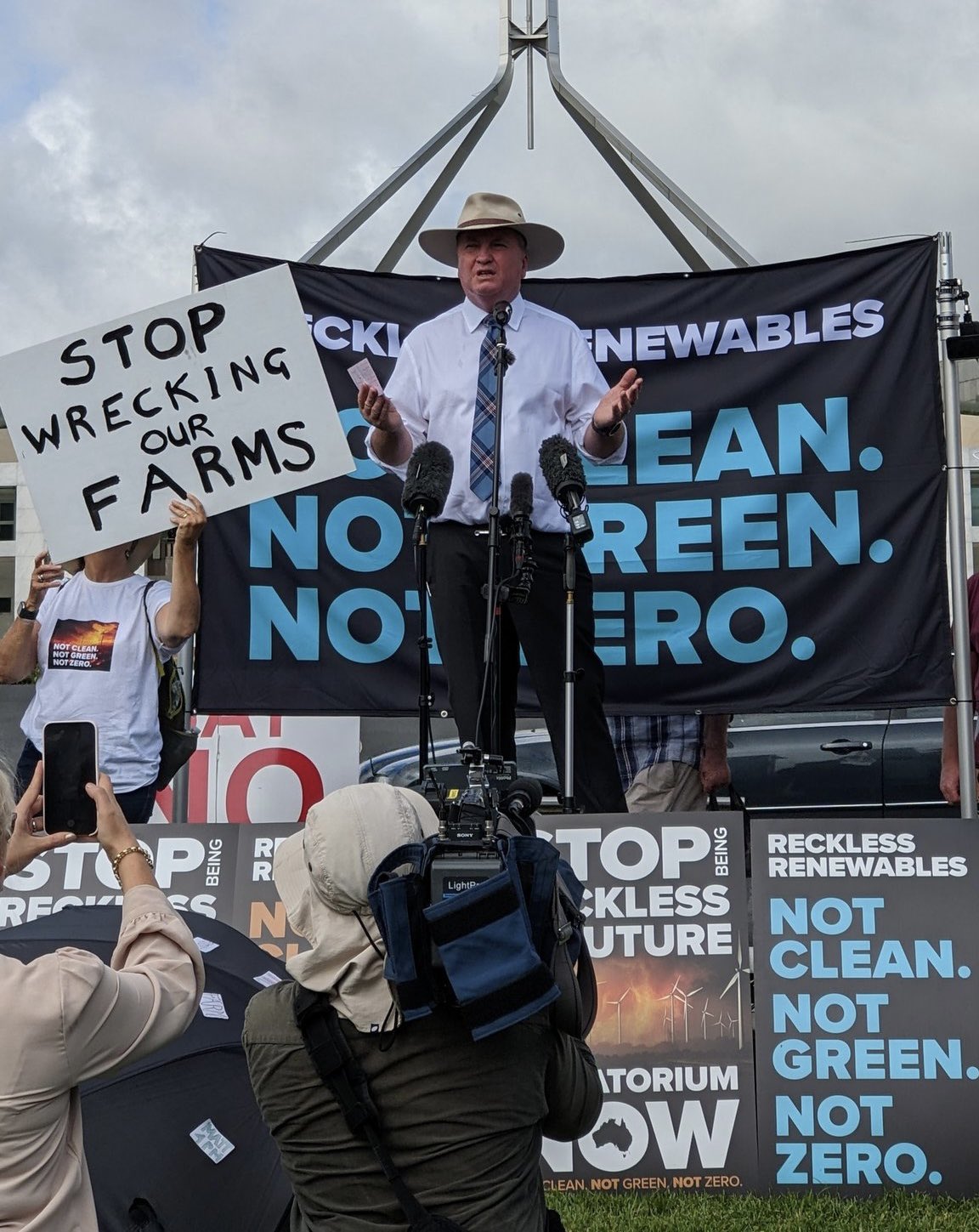Nationals Senator Barnaby Joyce, who attended with his former staffer and wife Vikki Campion told the rally that the new construction of wind and solar farms would risk killing off protected wildlife.