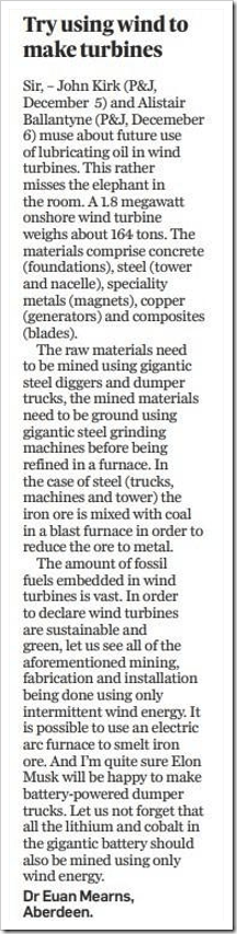 Sir, John Kirk (letters 5 Dec) and Alistair Ballantyne (letters 6 Dec) muse about future use of lubricating oil in wind turbines. This rather misses the elephant in the room. A 1.8megawatt onshore wind turbine weighs about 164 tons. The materials comprise concrete (foundations), steel (tower and nacelle), specialty metals (magnets), copper (generators) and composites (blades).