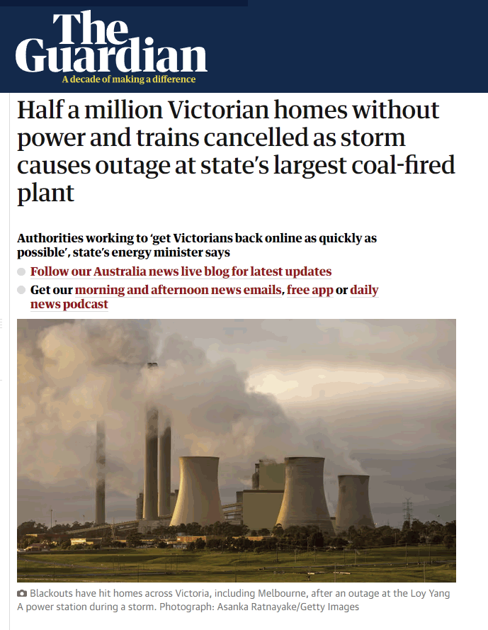 The Guardian, masters of misinformation, told us that the coal fired plants were affected by the storms, just in case you thought they might be stronger than flimsy windmills and giant sheets of glass panels.
