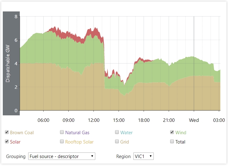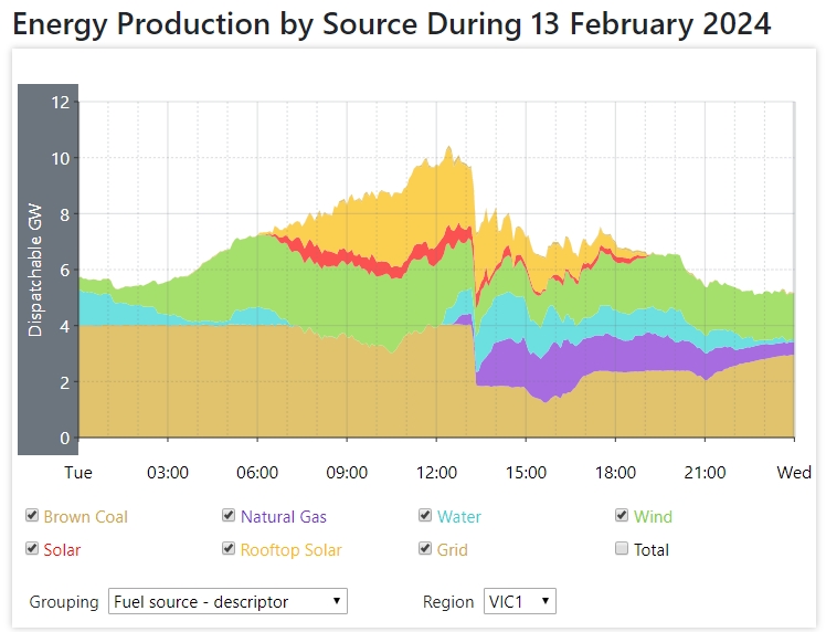 In Victoria the towers fell at 1:10pm during a storm. Their loss triggered the shut down of 4 large coal power units at Loy B Yang taking out 2 GW of generation. It took three hours to get one turbine back on line, and eight hours to restore the second. Everyone is talking about “the coal fired outage” but about half the wind power running at the time was also lost, and over the next hour, more than half the grid scale solar power also disappeared.