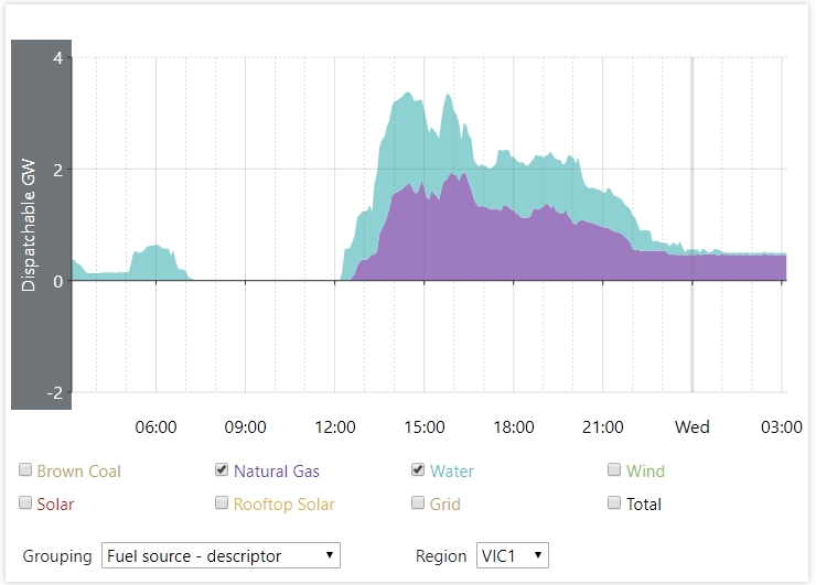 The things that did save the day were gas and hydro power (see below), but if Hazelwood coal power was still running, it would have helped too. Luckily, there is no drought on the East Coast at the moment. In a normal El Nino year, the hydro might not have been there…