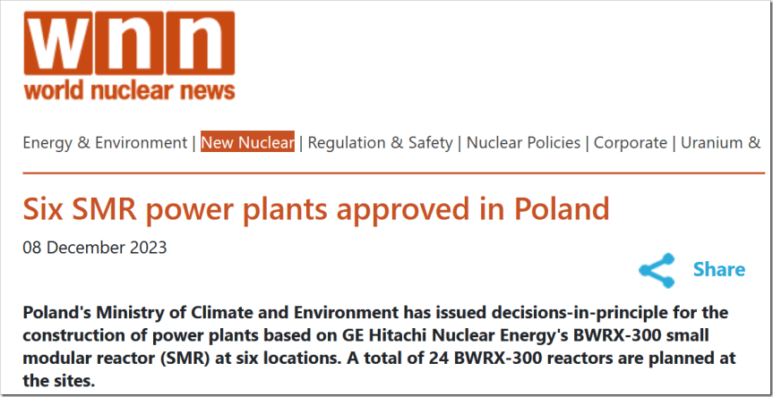 Which brings us back to the Poles. As Paul Homewood outlines below, Poland is not only lining up to build two new large-scale nuclear plants, it’s also well ahead of the curve when it comes to small modular reactors, with plans to build 6 those in the very near future.