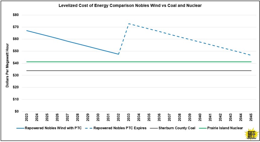 Nobles would theoretically cost less than Prairie Island in 2034, but the PTC would expire after 2032, and Nobles would go back to being 75 percent more expensive than the existing nuclear plant.