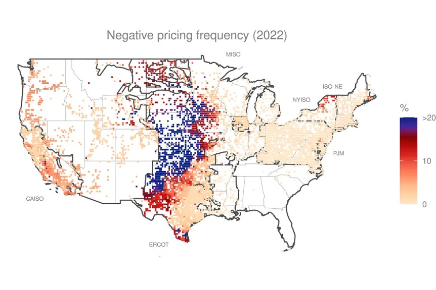 In reality, the PTC pays wind projects $26 for each MWh of electricity the facility produces, whether or not that electricity is needed. The subsidies mean that electricity generated from wind farms could potentially be sold into the market at a price of negative $25 per MWh and still turn a profit for their owners. This is why the areas with the most wind turbines see the most negative prices, which you can see in the map below.
