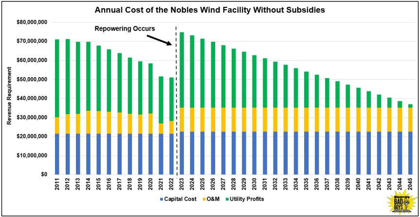 Our analysis did find that repowering the Nobles facility to requalify for the tax credit and extend the “book” life of the facility by ten years would slightly reduce the cost per MWh at Nobles for Xcel’s ratepayers compared to allowing the facility to run at lower capacity factors due to curtailment and allowing the subsidies to expire. That is, only if the facility operates for the “expected” 25 years this time.