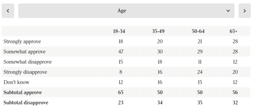 Among 35 to 49-year-olds, 50 per cent approved and 34 per cent were opposed.