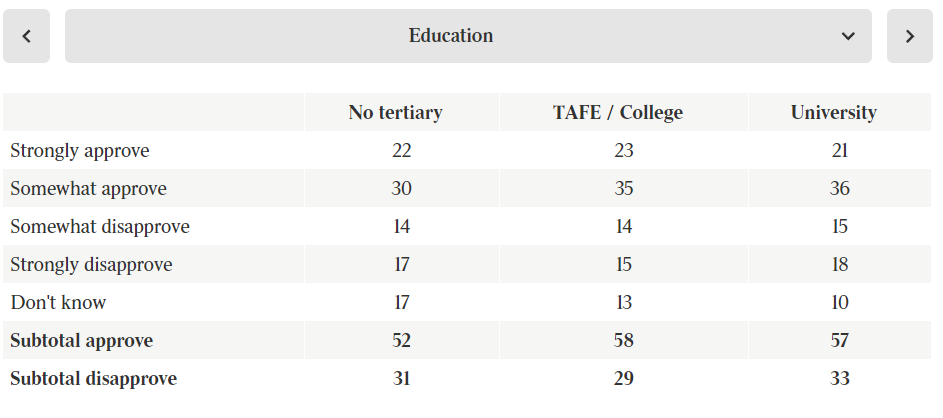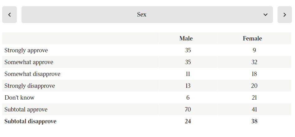 There was also a significant gender gap in support, with 70 per cent of male voters in support but only 41 per cent of female voters. Yet the number of women voters in support was still higher than those opposed at 38 per cent.