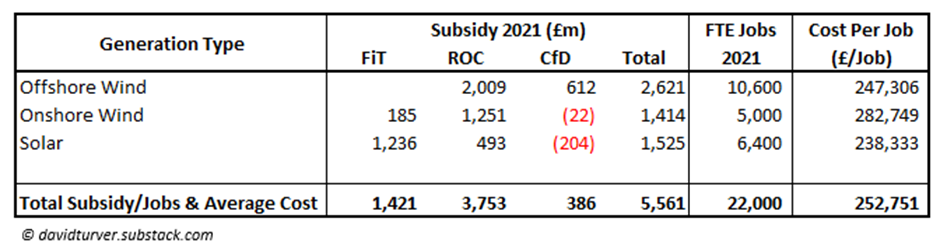 We can see that each offshore wind job cost £247,000 in subsidy, each onshore wind job nearly £283,000 and solar £238,000. The average across all three sectors is nearly £253,000 per job.