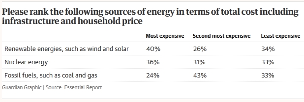 And, as this week’s Guardian Essential Report shows, one of the fundamental building blocks driving this narrative is unstable: people don’t believe renewables are cheaper.
