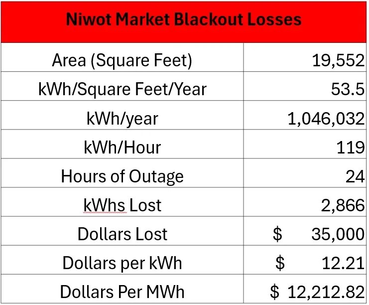 In a phone call with Seth Niwot, a co-owner of the Niwot Market, we learned that the store was without power for 24 hours and confirmed that it experienced around $35,000 in losses. This means the economic damage of interrupted electricity service to the grocery store was $12.21 per kWh, or an eye-watering $12,212.83 per megawatt-hour (MWh), which you can see in the table below.