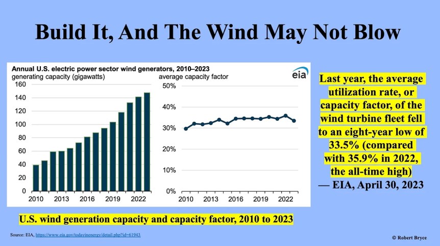 Um, yes. It would. And the EIA made that point in its usual dry language. “Generation from wind turbines decreased for the first time since the mid-1990s in 2023 despite the addition of 6.2 GW of new wind capacity last year,” the agency reported. The EIA also explained that the capacity factor for America’s wind energy fleet, also known as the average utilization rate, “fell to an eight-year low of 33.5%.” That compares to 35.9% capacity factor in 2022 which was the all-time high. The report continued, “Lower wind speeds than normal affected wind generation in 2023, especially during the first half of the year when wind generation dropped by 14% compared with the same period in 2022.”