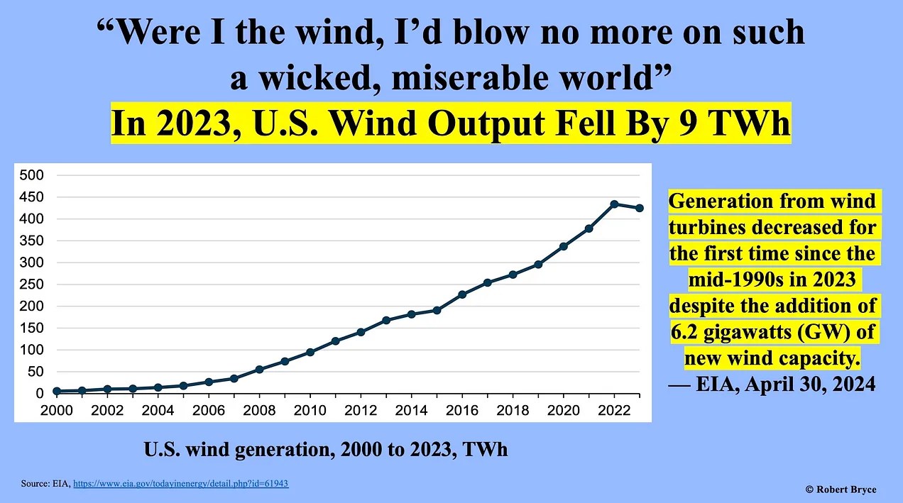 In the US, wind power output dropped by 14% in the last half of 2023, and since then things haven’t much improved.