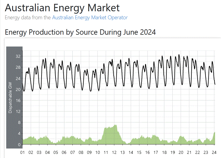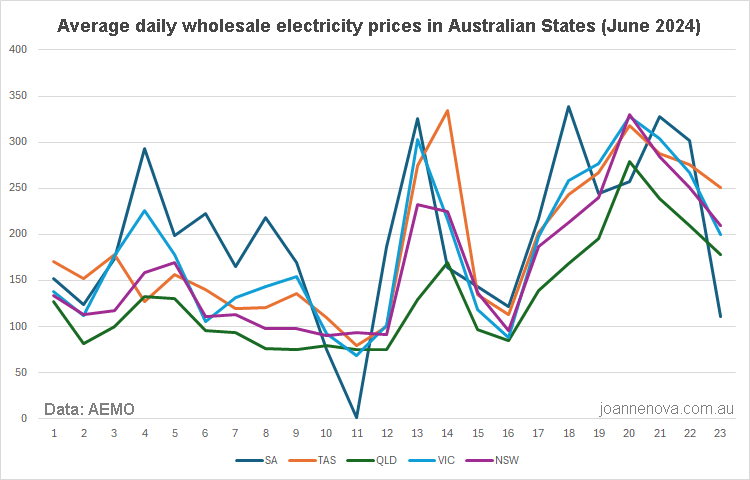 Some of the lows like June 20th caused mayhem because they were hitting at dinner time when solar power has gone to bed. Back before the subsidized renewables gold rush, prices would average $30/MWh across the whole grid — not just all day, but all month. This month so far, average prices respectively are SA $197, Tas, $287, Qld $132, Vic $182, NSW $165.