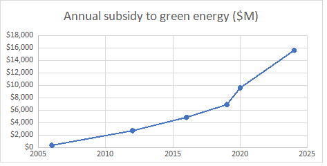 These subsidies are, unlike other government direct spending and regulatory measures, actually designed to destroy one supply source, coal, and replace it with renewables. The increase in these subsidies bells the cat in claims that renewables are the cheapest form of electricity.