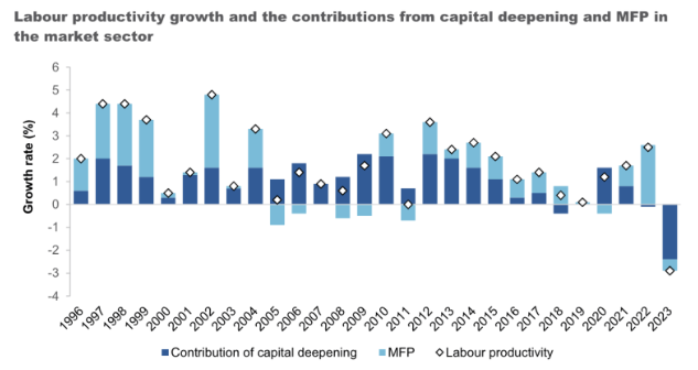 The Productivity Commission depicts the generally downward trend in productivity since the mid-1990s, punctuated by a mini recovery that petered out about a decade ago. In 2022-23 productivity actually fell by 3.7 per cent and remains below its 2021-22 level.
