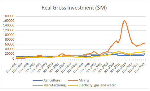 The dominance of mining in national investment, especially in the last 20 years, is evident, as is its collapse over the past 10 years.