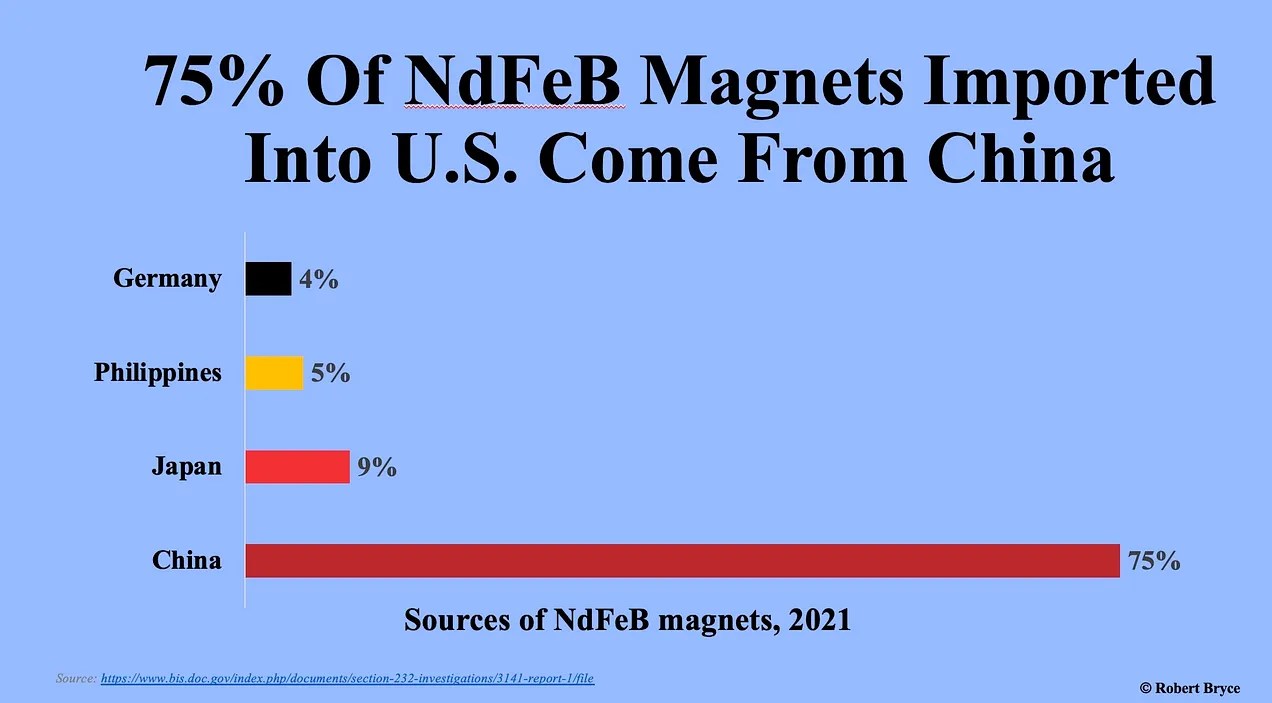 In 2022, the Commerce Department published a heavily redacted report that contains this key sentence: “Based on the findings in this report, the Secretary concludes that the present quantities and circumstances of NdFeB magnet imports threaten to impair the national security as defined in Section 232 of Trade Expansion Act of 1962, as amended.” It continued, noting that the U.S. “has extremely limited capacity to manufacture NdFeB magnets and is nearly one hundred percent dependent on imports to meet commercial and defense requirements. In 2021, the United States imported 75 percent of its sintered NdFeB magnet supply from China, with nine percent, five percent, and four percent coming from Japan, the Philippines, and Germany, respectively.”