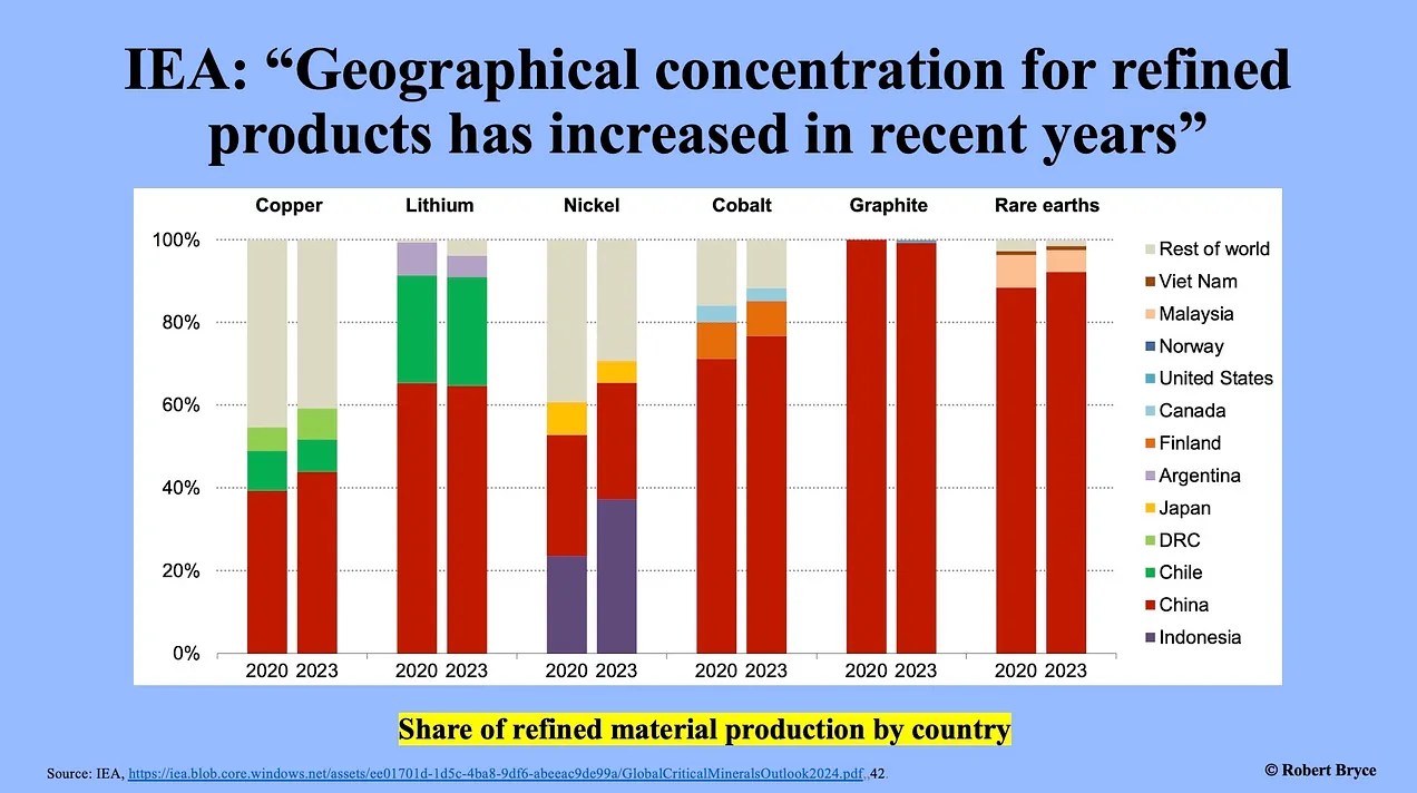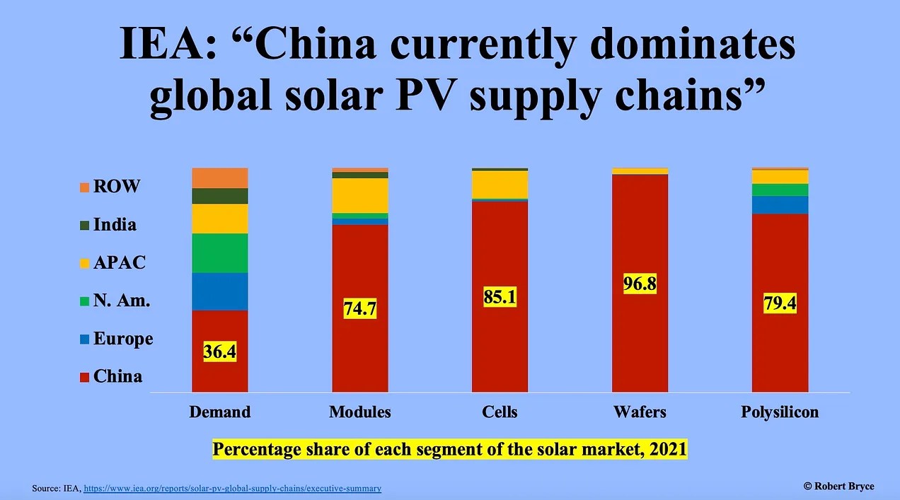 Although the U.S. and other countries are talking about reducing their dependence on China, the IEA report shows that China’s dominance of the alt-energy supply chain isn’t declining, it’s increasing.