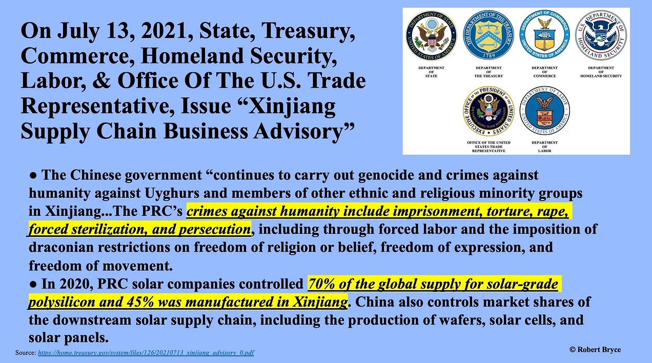 Recall that three years ago, the Biden administration determined that China’s solar sector was connected to the repression of Uyghurs in Xinjiang province. Last September, the Biden administration issued an addendum to the 2021 advisory on doing business in Xinjiang, saying it contains new information “about the ongoing, widespread, and pervasive risks in supply chains posed by state-sponsored forced labor and other human rights abuses in Xinjiang.” In December, the State Department updated Congress on the sanctions imposed on Chinese suppliers under the Uyghur Human Rights Policy Act.