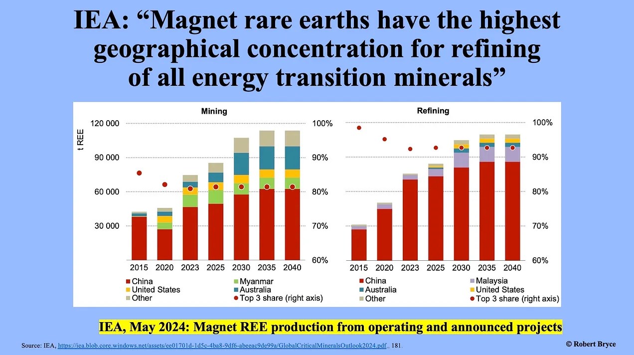 The new IEA report also spotlights China’s monopoly over the high-strength magnets in wind turbines and EVs. It said that magnet rare earths — that is, praseodymium, neodymium, terbium, and dysprosium — “have the highest geographical concentration for refining of all energy transition minerals.” Those elements are essential ingredients in the NdFeB magnets used in wind turbines, EVs, military weaponry, and a panoply of consumer goods.