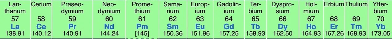The rare earth elements, also known as the lanthanides. Pr, Nd, Tb, and Dy are particularly important for their use in magnets.