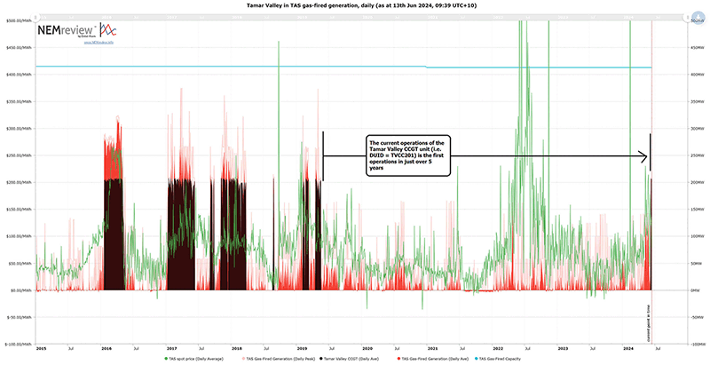 There’s been a wind drought in the last three months in Australia, which meant hydro power had been used more than expected to fill the gap. But wouldn’t you know it, it’s been dry spell for most of the last year in Tasmania too and the dams were getting low. So on June 6th, the Combined Cycle Gas plant at Tamar Valley was set up to run for the first time since 2019.