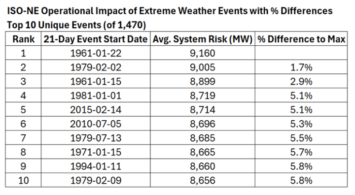 One of the important results presented in the ISO-NE analysis was a table of projected system risk for weather events over the 72-year data record. In the analysis, system risk was defined as the aggregated unavailable supply plus the exceptional demand during the 21-day event. Note that the analysis considered sliding windows for the 21-day events by shifting the 21-day window every seven days.