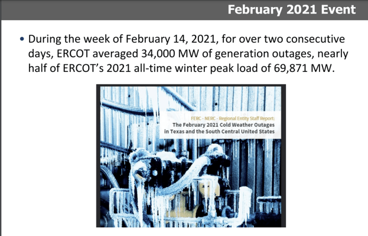 The North American Electric Reliability Corporation (NERC) recently convened a webinar for the Cold Weather Preparedness Small Group Advisory Sessions (SGAS) to “provide an educational opportunity for registered entities to meet with NERC and Regional Entity representatives to discuss the cold weather preparedness Standards and possible compliance approaches in an open and non-audit environment.” The impetus for this initiative was the February 2021 Texas event described in the following slide. The regulatory fallout for this event is not finished but the need to discuss how best to address these events is so acute that SGAS was established in “an open and non-audit environment”.