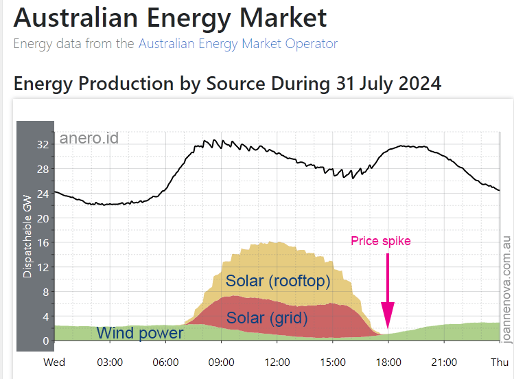 Never once do these characters ever confront the daily total collapse in solar output (aka ‘sunset’) and the regular near-total collapses in wind power output (aka ‘calm weather’); never once do they suggest that the chaotic delivery of wind and solar might well be the root cause of the power pricing and supply calamity that’s afoot.