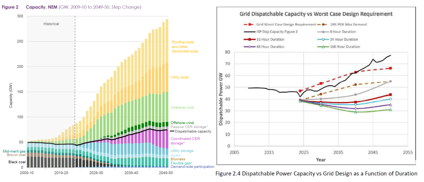Figure 2.4 in our submission (see below) provided an alternative version of this chart showing the true dispatchable power over various periods based on ISP data for energy storages (ISP Figure 20). By 2040, the dispatchable power of AEMO’s ISP design falls to just 30 GW for backup durations of one week but at the same time it indicates that for 16 hours overnight, it is only 37 GW. However, a proper engineering design with a 20% dispatchable reserve margin will require over 60 GW by 2040.