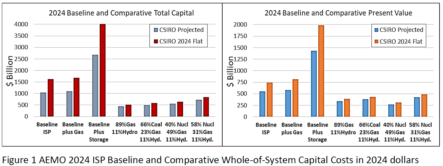 The whole-of-system analysis in this report, draws on 2024 ISP capacities for generation and storages and CSIRO 2024 GenCost cost factors [2], and shows total capital costs for the 2024 ISP over one trillion dollars for a system unable to deliver reliable power [3]. This is about twice the capital costs of four alternative grid designs using gas, coal and nuclear. When fuel costs for gas and coal are considered, nuclear plus gas designs are likely to be the least costly of all options.