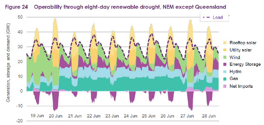 In the ISP, Figure 24 (p72) attempts to illustrate operability through an eight-day renewable drought for the “NEM except Queensland”. ISP Appendix 4 (Figure 15 p 26) reveals that this simulation test involved an “extended VRE drought event running from 21 June 2040 to 28 June 2040 (reflective of conditions observed historically in June 2019).”