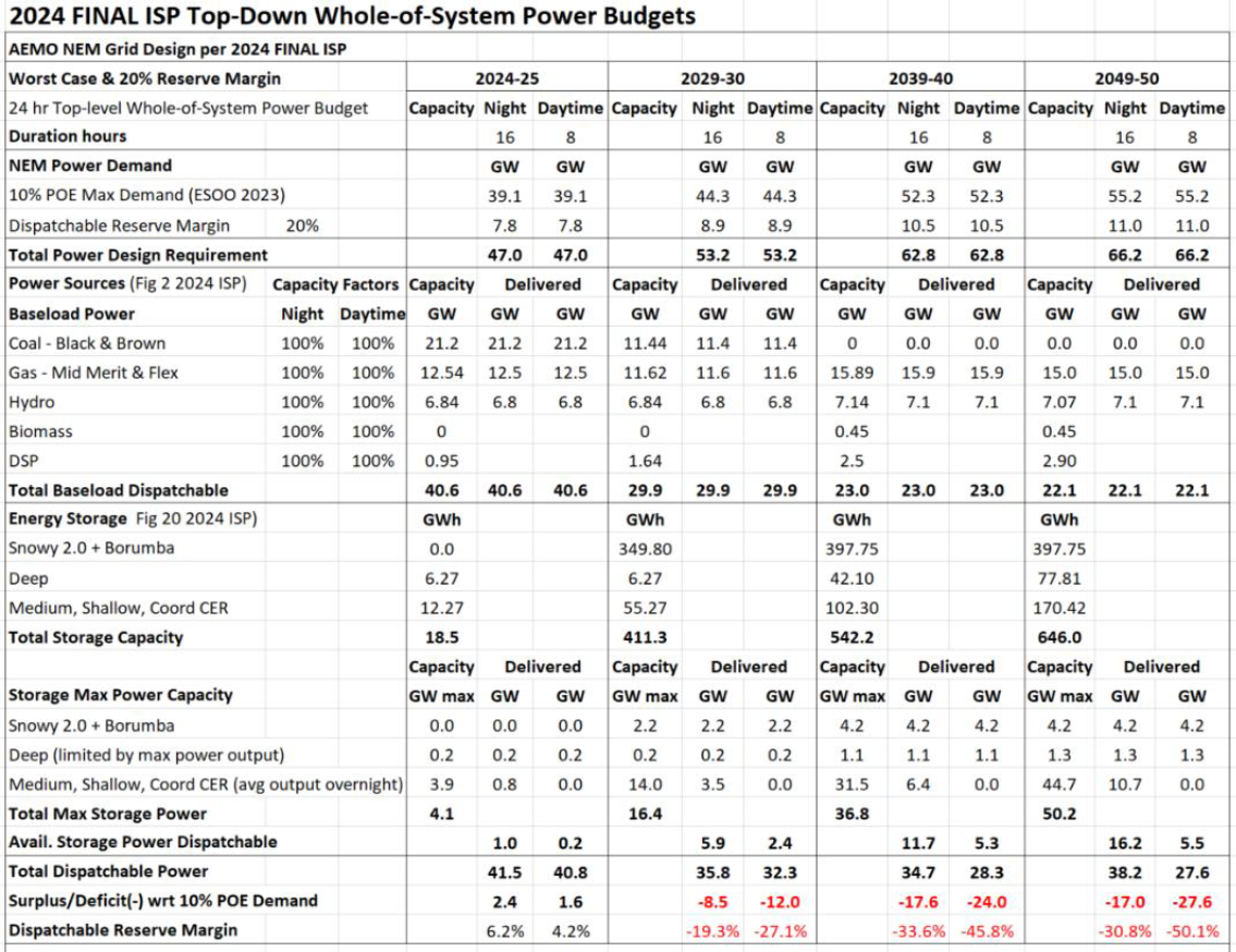 Proper high reliability engineering design requires use of worst case conditions plus a margin for facility outages for maintenance and repairs. A whole-of-system power budget table (on the next page) is based entirely on AEMO’s ISP data.