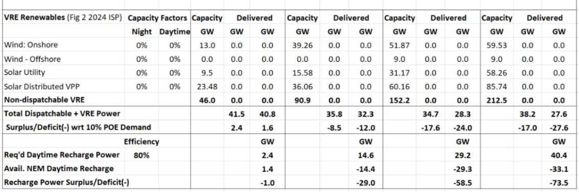 By 2030, the dispatchable reserve margin falls from historic levels in excess of plus 20% to minus 19% and in subsequent years it is substantially worse. It cannot deliver adequate power when NEM-wide grid demand is maximum and when overnight solar is zero and wind output is close to nothing.