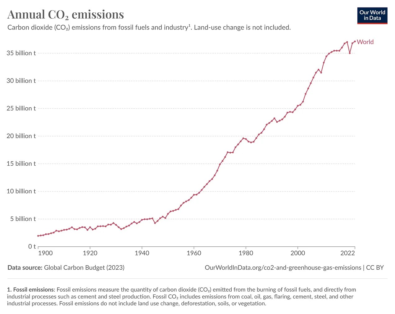 Second, mitigation can only work if everyone else slashes emissions too and we can see from Figure 2 (from Our World in Data) that this is not happening.