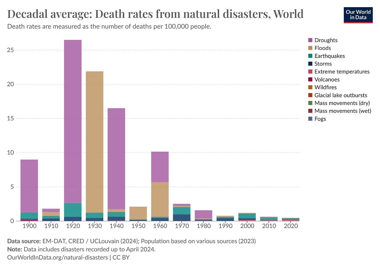Adaptation has been a remarkable success. The rate of people dying from natural disasters has plummeted by a factor of more than 50 in the past century as shown in Figure 3 below, sourced from Our World in Data.