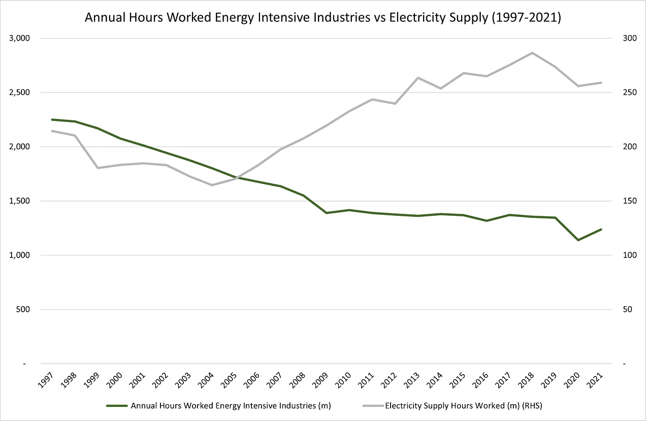 Net Zero is driving us to penury. Significant damage has already been done with productive industries shrinking compared to the whole economy since 1997. The trouble is, these industries are far more productive in terms of Gross Value Added (GVA) per hour worked than most service industries, and they consume more energy. This is why Sir Jim Ratcliffe has warned that the “chemicals industry in the UK is finished” and the main reason is that energy costs are five times those of the US and there are carbon taxes levied on such products. This explains why we have lost six times as many jobs in energy intensive industries than have been gained in our green energy sector (see Figure 5).
