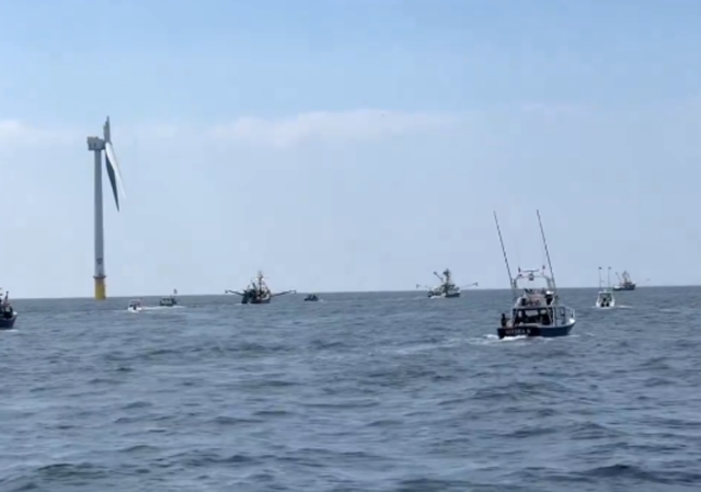 Now this weekend, a “flotilla” of about two dozen commercial and recreational fishing vessels steamed to the wind farm on Sunday to protest offshore wind development.