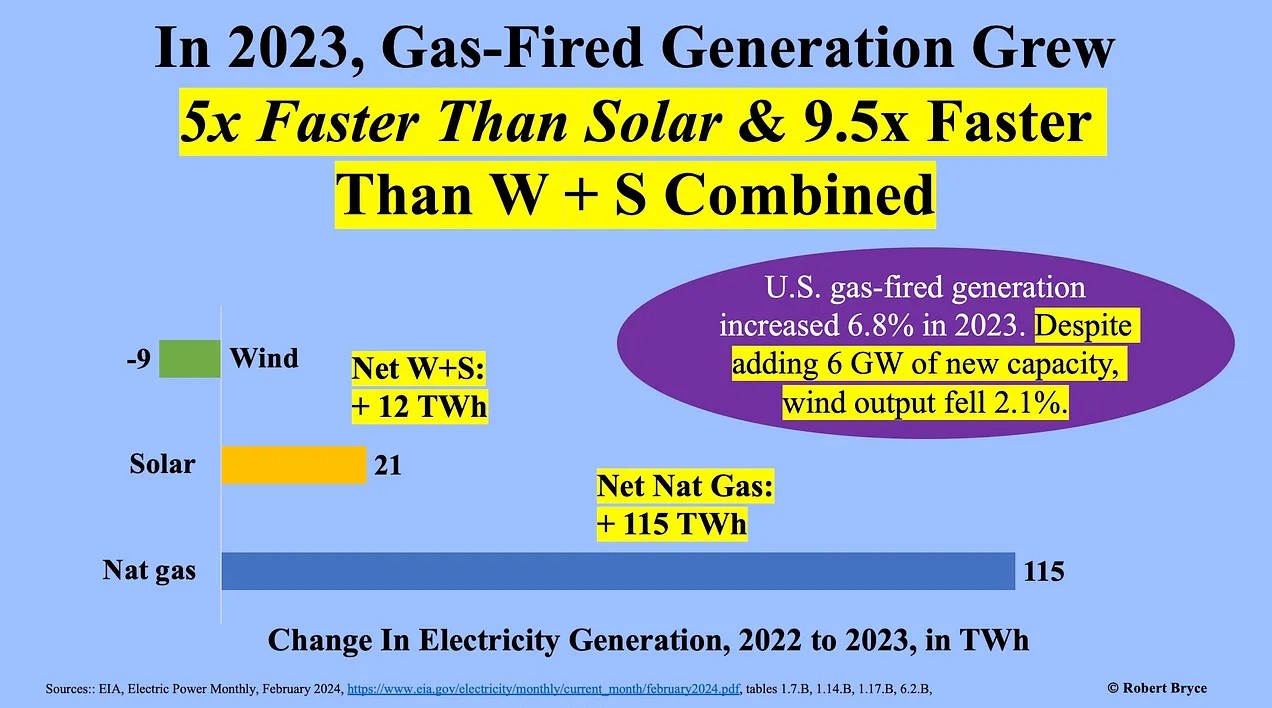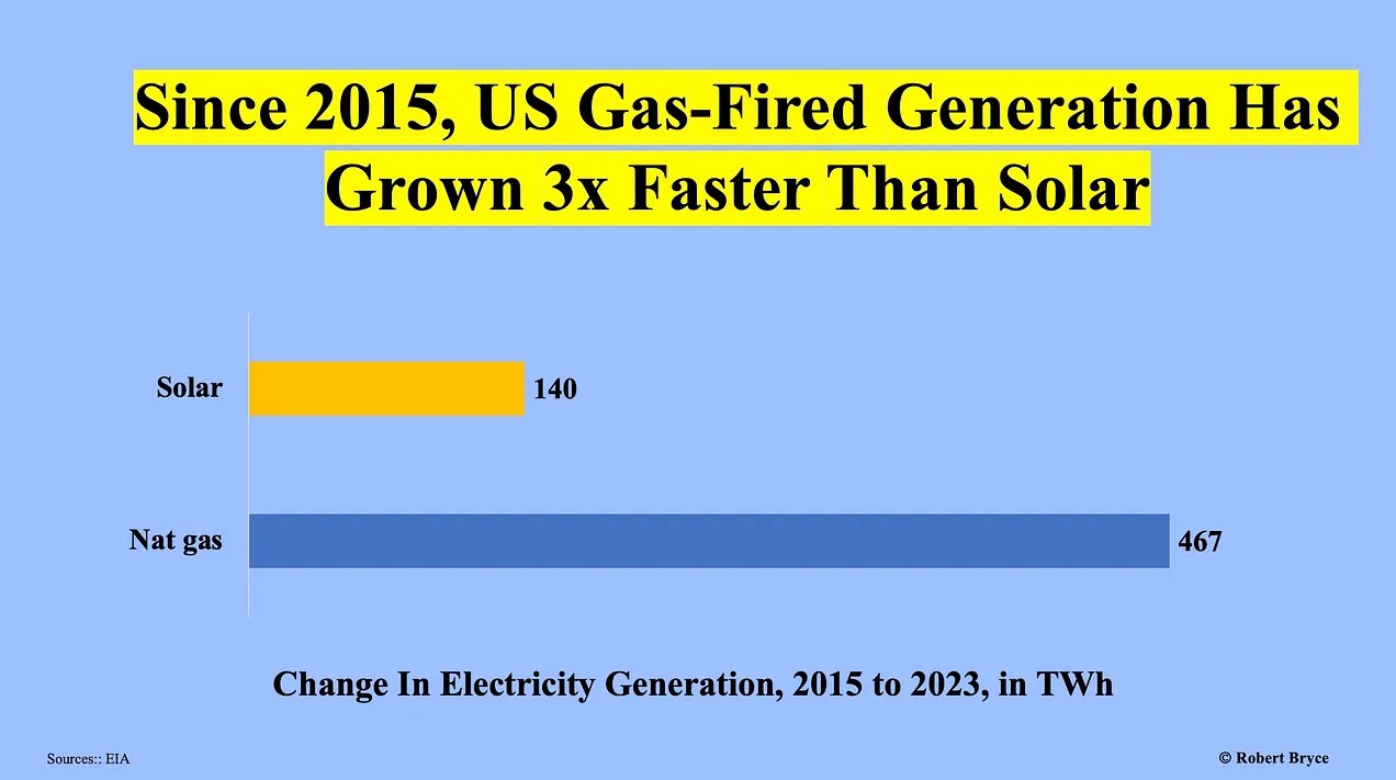 As seen above, that growth continued last year when gas-fired generation grew by 115 terawatt-hours while solar increased by 21 TWh. Put another way, gas-fired generation grew five times faster than solar last year.