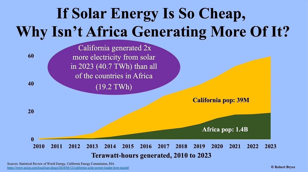 Wallace-Wells also ignores the vast disparity in solar deployment around the world. He claims, “by some ways of tabulating, solar power is already cheaper than all other new sources of electricity for something like 95 percent of the world.” And what are those ways of tabulating? He doesn’t say. That begs the question: if solar is so cheap, why isn’t Africa using more solar? As seen in the graphic above, the unfortunate answer is that solar is still mainly used in wealthy places. That helps explain why California, a state with 39 million people, is generating twice as much electricity from solar as Africa, even though the African continent has roughly 36 times more people than the Golden State.