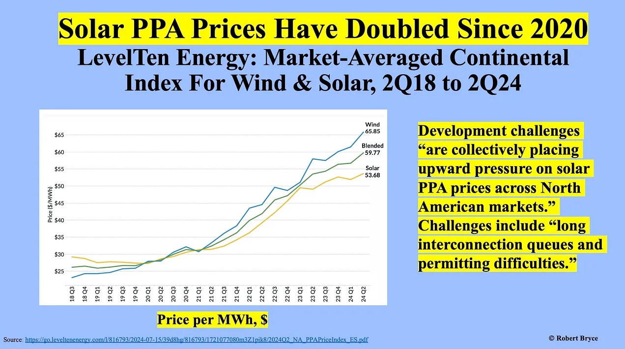 Wallace-Wells can cheer until my PV panels are destroyed by the next hail storm, but he might consider resting on his pom poms for a moment to report on what’s happening in the marketplace. As seen above, solar prices aren’t falling. They are rising. In July, consulting firm LevelTen Energy reported that prices for solar power purchase agreements rose 3% during the second quarter and that solar prices have nearly doubled since 2020. LevelTen said the price surge reflects “the development challenges that are collectively placing upward pressure on solar PPA prices across North American markets.” It continued, saying the challenges include: