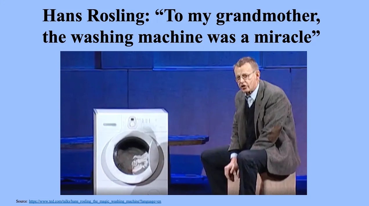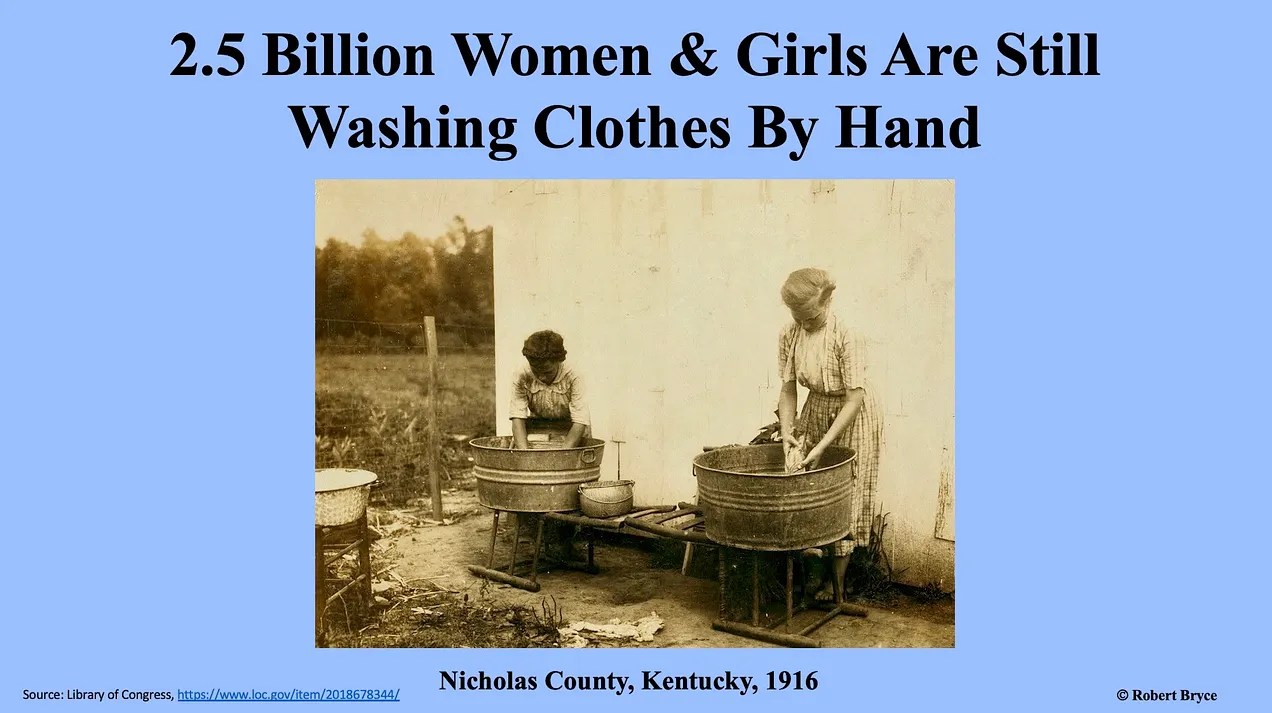 A few years ago, the late demographer Hans Rosling estimated that some five billion people are wearing clothes that have been washed by hand. That means that about 2.5 billion women and girls are doing that washing.