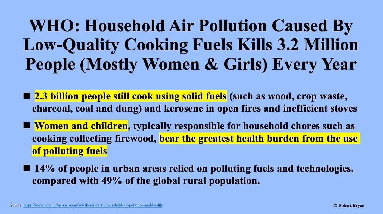 Again, the numbers are shocking. I explained to the students that most of those 3.2 million deaths per year could be prevented if developing countries had enough propane and butane stoves. Clean-burning LPG could replace the wood, straw, dung, and charcoal that is now being used. That, in turn, would ease the indoor air pollution problem and save untold numbers of women and girls from contracting respiratory ailments and, in many cases, from premature death.
