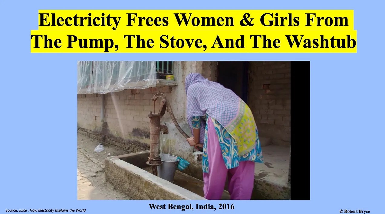 I began with the photo above. As I explained in my latest book, A Question of Power: Electricity and the Wealth of Nations, Rehena is a resident of Majlishpukur, a tiny agricultural settlement located southeast of Kolkata. When I met her, she was 44 years old. A soft-spoken, elegant woman, she had her first child, a girl, when she was 16. Two other children, a boy and a girl, came shortly afterward. My friend, Joyashree Roy, a senior fellow at the Breakthrough Institute, explained in Bengali that we wanted to discuss electricity. Rehena replied that her modest home had been connected to the electric grid 14 years earlier. In A Question of Power, I wrote: